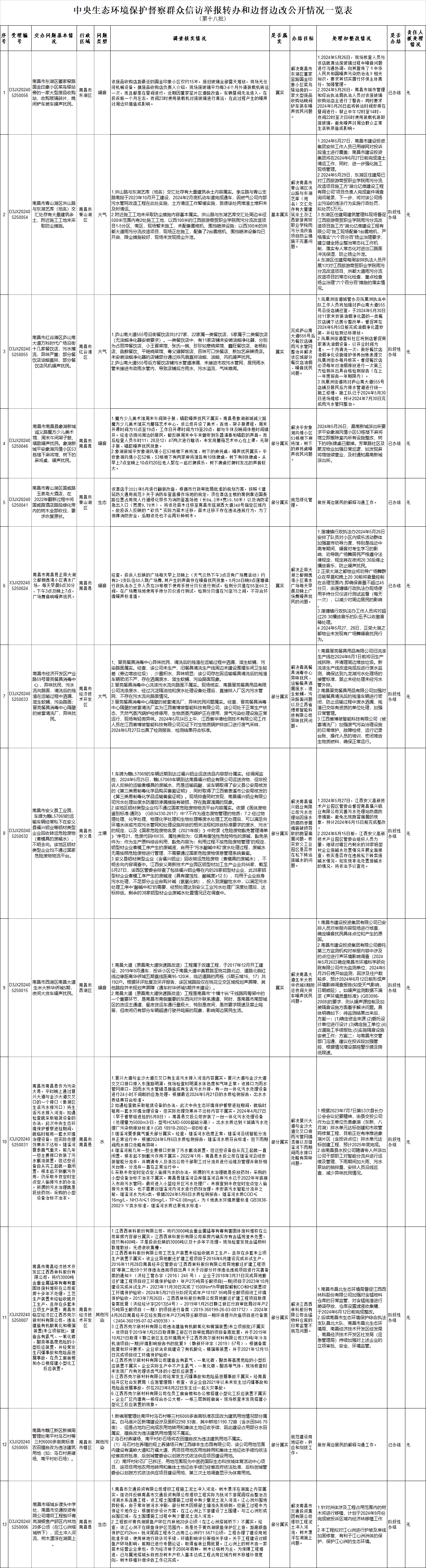 截至6月4日,对中央第三生态环境保护督察组向南昌市移交的第十八批群众信访举报件13件,各责任单位均按要求上报调查处理情况。根据督察要求,群众信访举报转办和边督边改公开情况一览表在报纸、网站等媒体上公布。