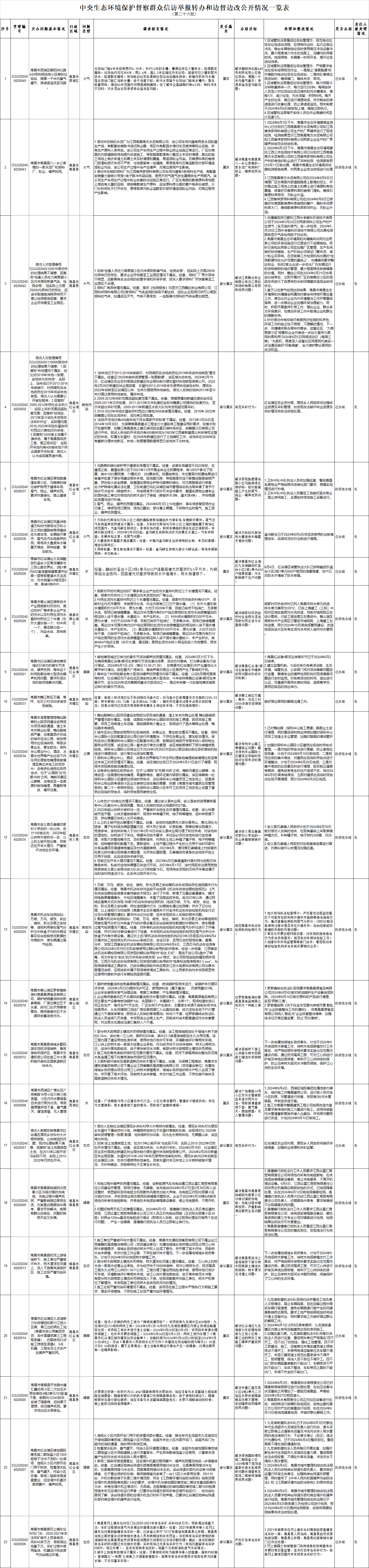 中央生态环境保护督察群众信访举报转办和边督边改公开情况一览表(第二十六批)