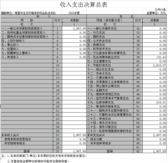 本单位2022年度支出总计2957.5万元,其中本年支出合计2957.5万元,较2021年增加988.71万元,增长50.2%,主要原因是:机构改革,区生态环境局执法大队人员上划,人员增加;年末结转和结余0万元,较2021年增加0万元,增长0%,主要原因是:实行零基预算。
