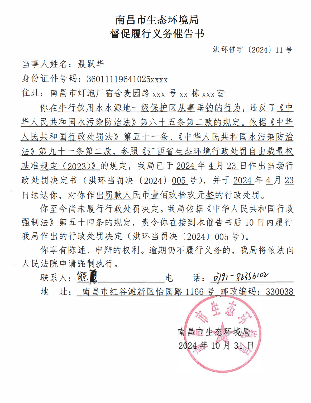 因其他方式无法送达,现向你公告送达督促履行义务催告书(洪环催字〔2024〕11号)