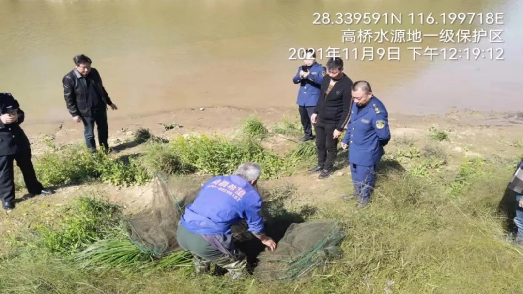 联合执法组在高桥饮用水源地取水口下游一级保护区90米处内现场抓获焦某旺在进行违规垂钓,随后,分别在高桥饮用水源地取水口上游一级保护区300米处内现场抓获叶某违规投放地笼和吴某华违规垂钓行为。执法人员当即对缴获鳜鱼1条、鲫鱼5条予以放生。