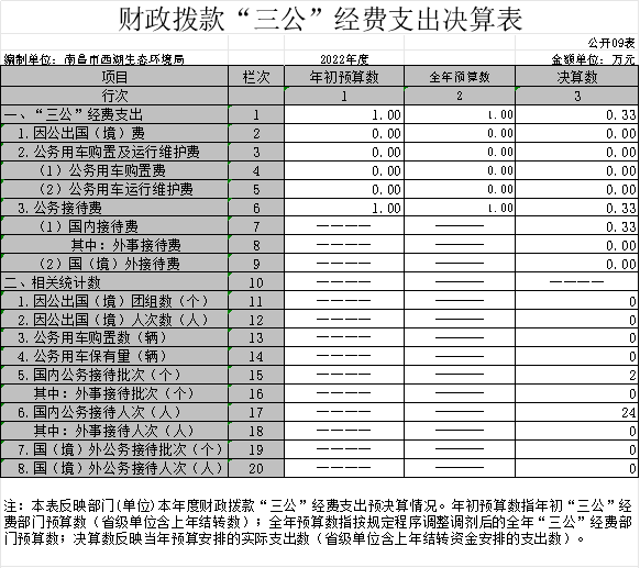 本单位2022年度财政拨款“三公”经费支出全年预算数为 1万元,决算数为 0.33万元,完成全年预算的 33 %,决算数较2021年减少0.03万元,下降8.3 %,其中: